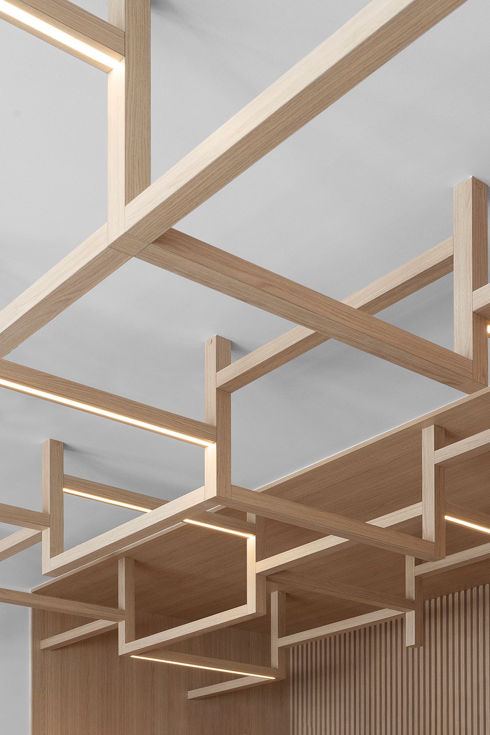 Initially, the design team encountered challenges with the varying elevations of concrete beams and a ceiling height lower than anticipated. They ingeniously addressed this by crafting a ceiling feature composed of wooden slats suspended at different heights, connected through sleek, straight lines. Integrated custom lighting within the slats casts a warm glow, creating an elegant interaction between light and wood tones.