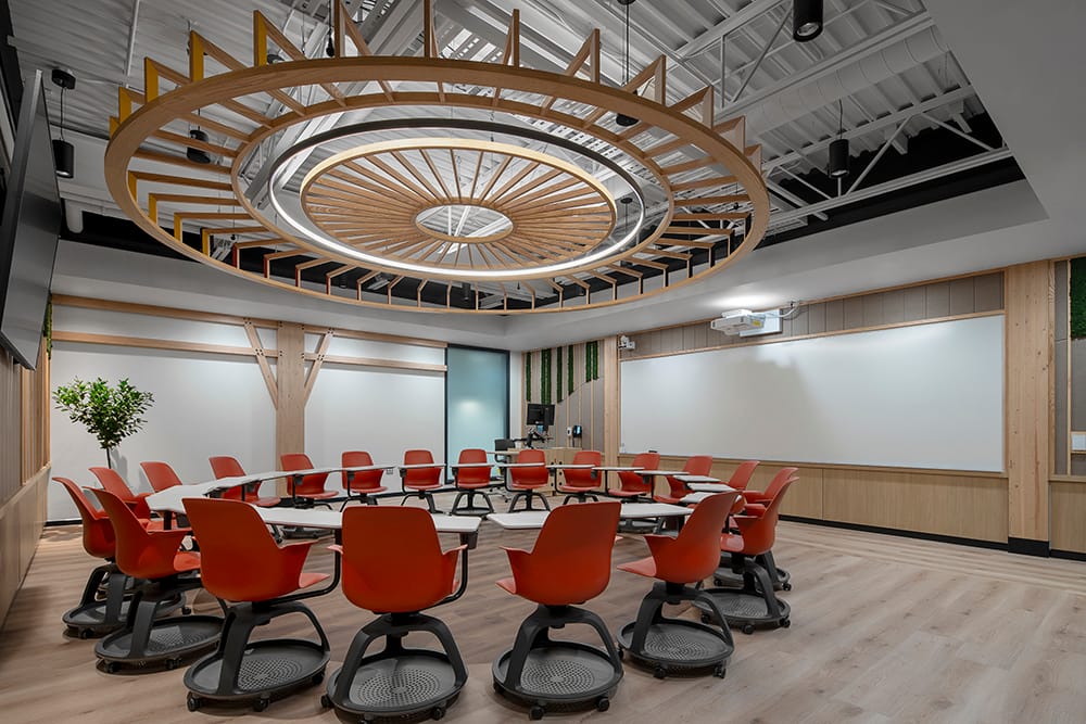 One standout feature is the intricately detailed circular wood ceiling, which incorporates the four colors representing the cardinal directions: North, South, East, and West. Additionally, the classrooms are equipped with state-of-the-art exhaust systems to accommodate traditional smudging ceremonies, ensuring that Indigenous practices are honored and reflected.