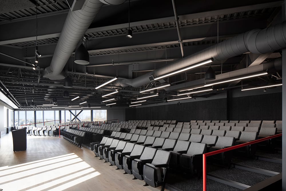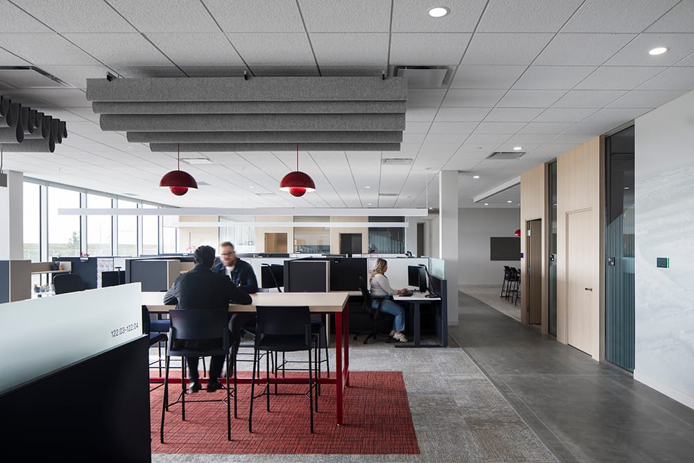 Materially, the interiors echo the structure’s angular geometry. Calm, monochromatic palettes form a restrained base, punctuated strategically with Dow’s signature red for accents and wayfinding. Sightlines stretch outward, framing prairie panoramas and reinforcing a subtle dialogue with the surrounding landscape.
