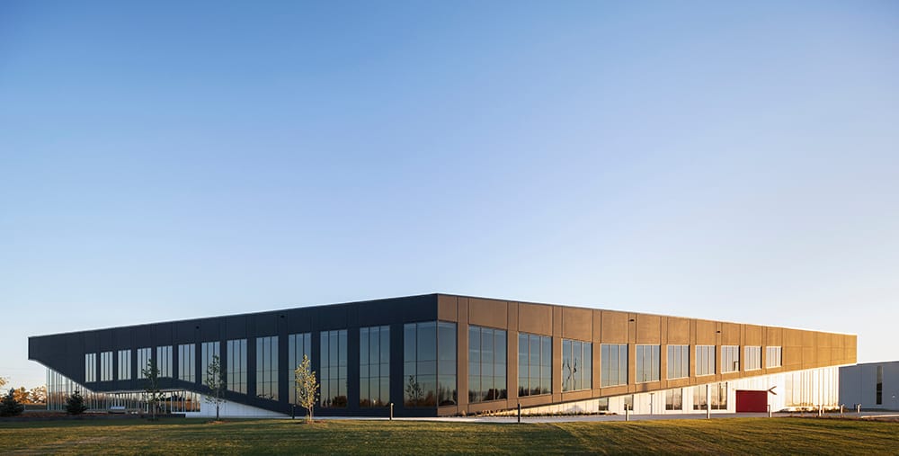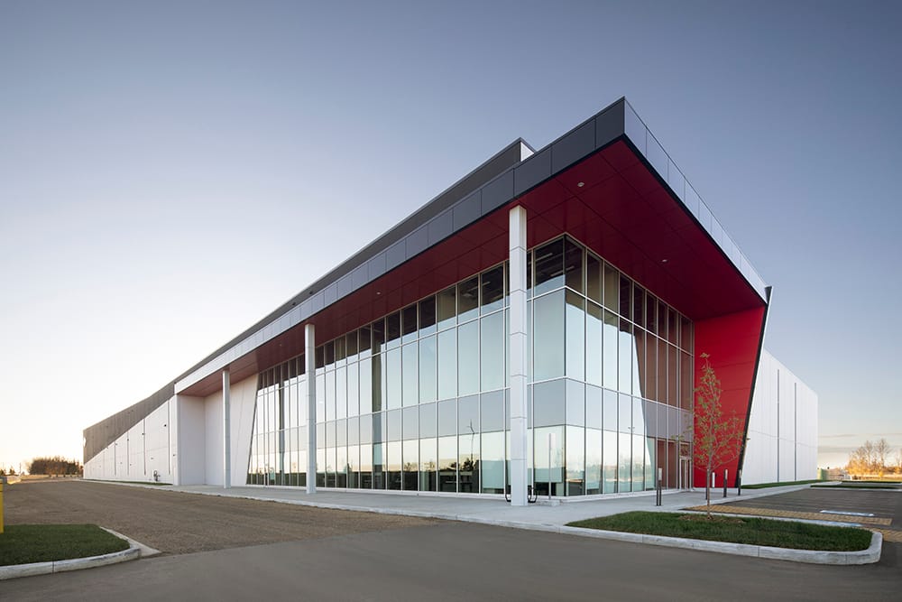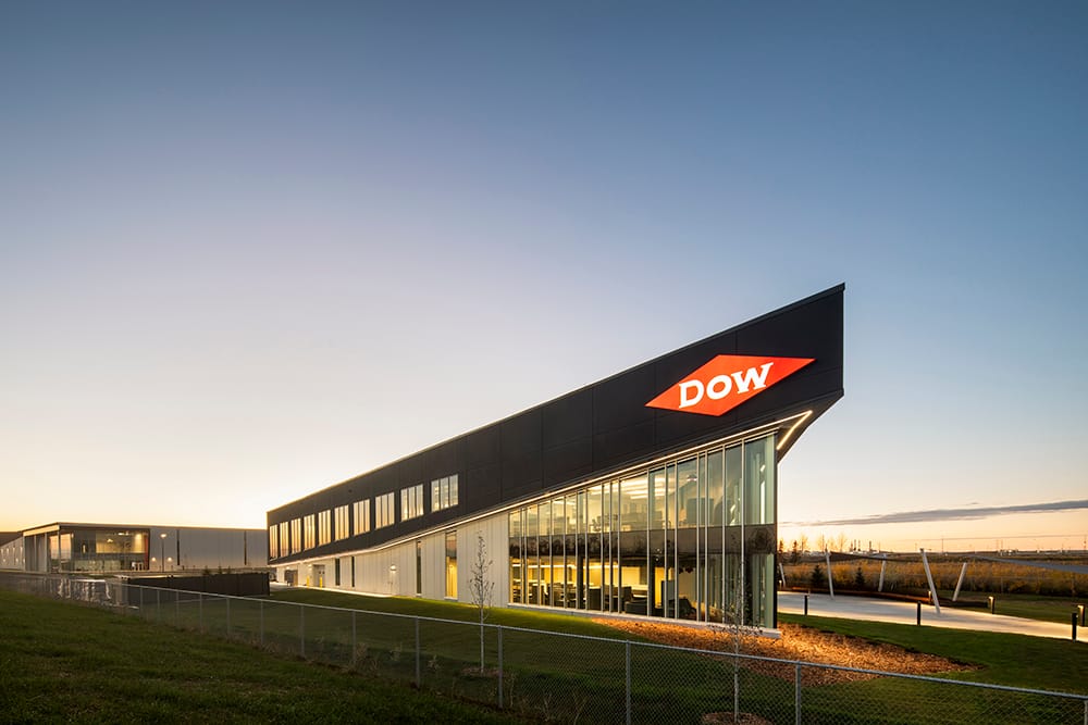 Referencing Dow’s iconic diamond emblem, the building’s massing translates brand into built form. Precast concrete volumes and glass curtain walls are composed in a geometric configuration that reads clearly from both ground level and aerial perspectives. Against Alberta’s expansive prairie skies, the structure becomes both object and marker, a deliberate counterpoint between earthbound materiality and horizon line openness.