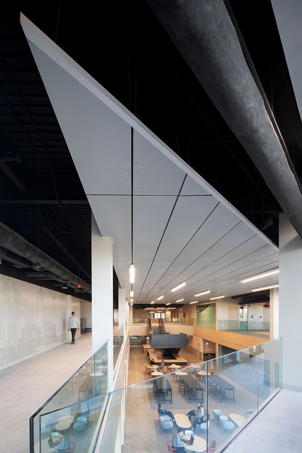 Conference rooms, a large auditorium, fitness and commissary facilities, outdoor dining areas, and a central common space serve as connective tissue. These shared environments are designed not as afterthoughts, but as the social core of the facility.