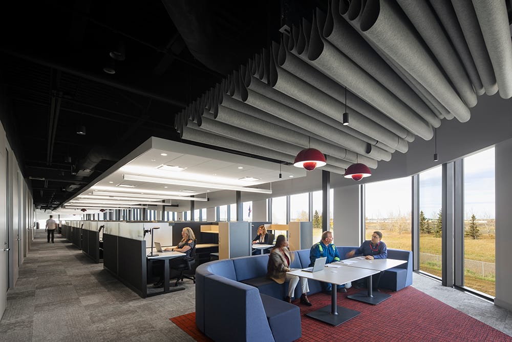 The interior follows an activity based workplace model, balancing focused work zones with collaborative areas designed for coordination across teams. Administrative and site support functions coexist in a layout that prioritizes operational efficiency while maintaining durability suited to an industrial context.
