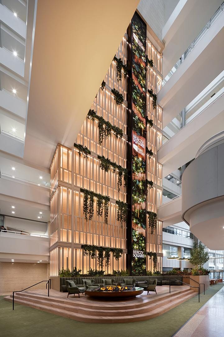 The interiors draw heavily from natural elements—introducing greenery, organic forms, and layered textures to soften the experience of a dense downtown office environment.