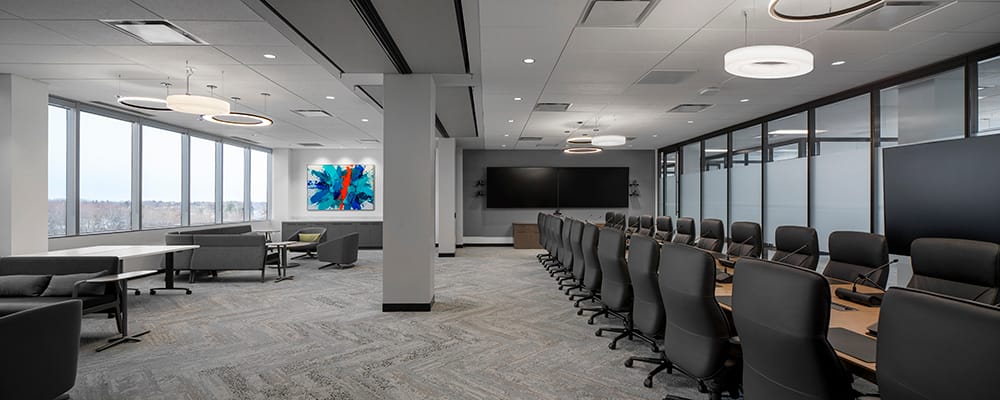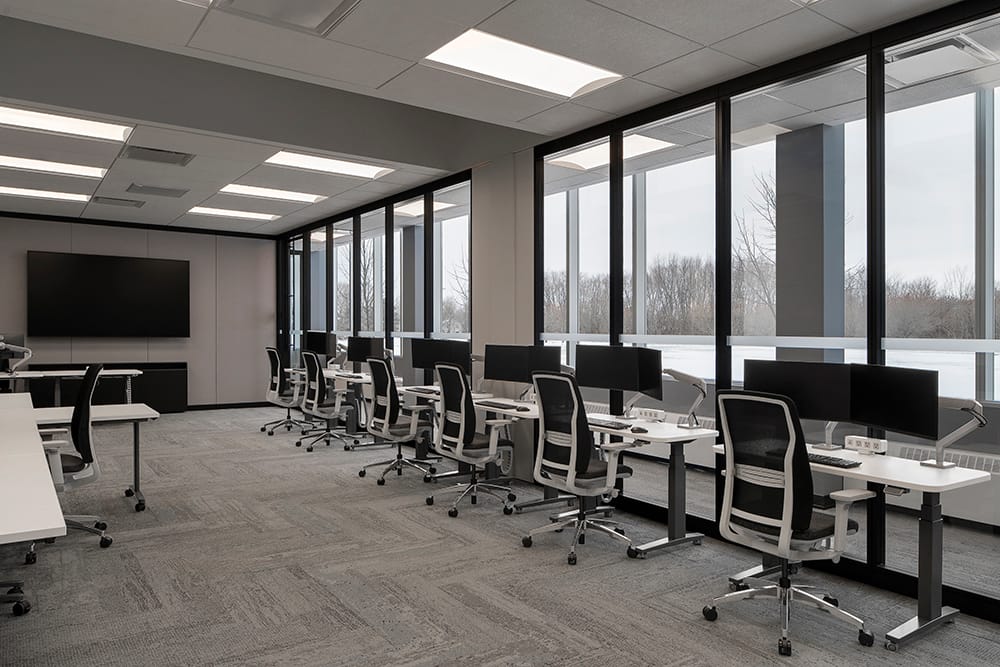 Rather than replacing the original building, the project focused on adaptive reuse, revitalizing the 110,000 square foot facility while maintaining its strong architectural presence within the surrounding landscape. The dark glass façade and tiered massing remain a recognizable feature of the property, while the interiors have been entirely reconfigured to support a modern workplace environment.