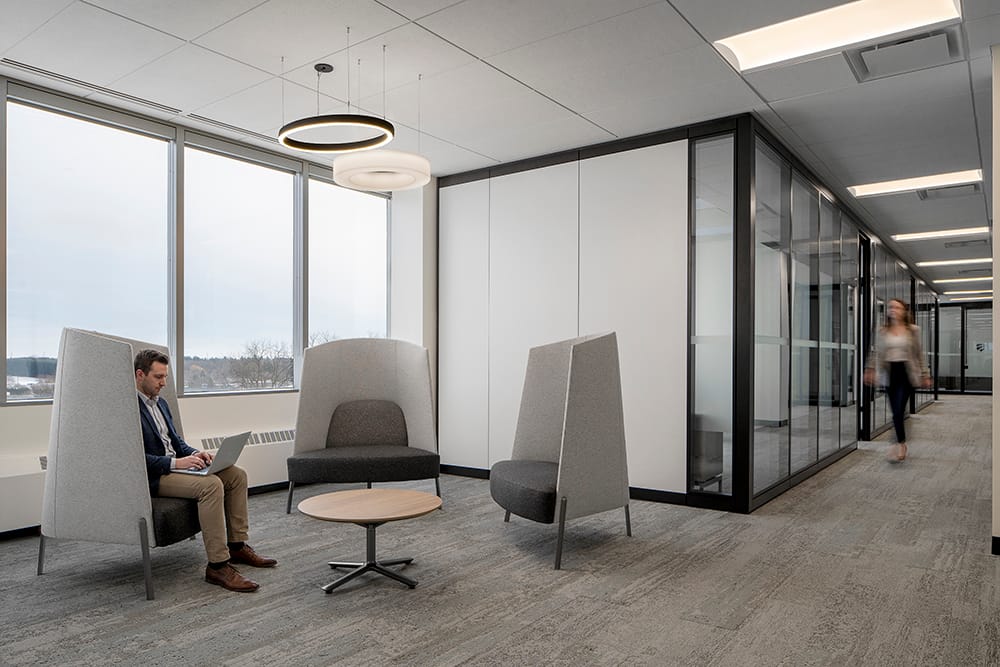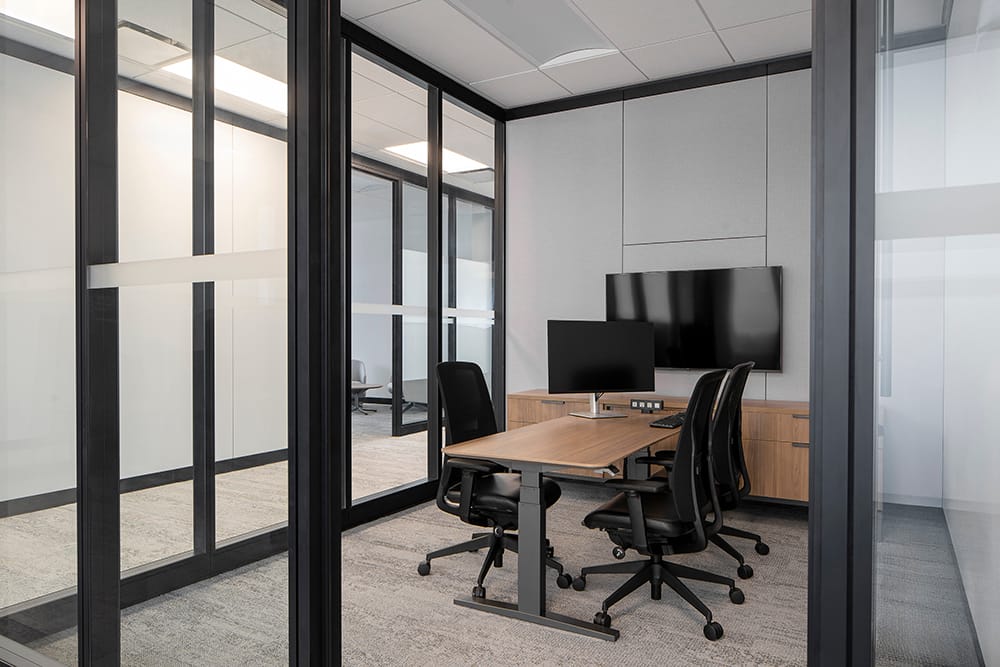 Glass-fronted offices and meeting rooms allow natural light to travel deeper into the floor plates while maintaining visual openness across departments. Informal seating areas and enclosed collaboration pods create opportunities for small group discussions, quick meetings, and quiet conversation.