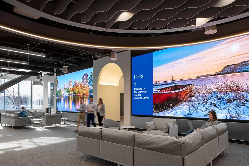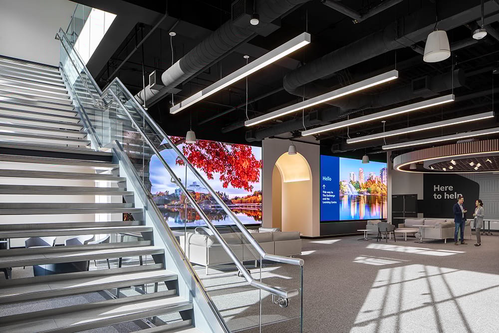A feature staircase anchors the lobby, connecting the entry level to the floors above while encouraging movement and visual connection throughout the space. The digital displays introduce dynamic imagery that reflects landscapes and communities across Ontario, reinforcing the organization’s provincial presence.