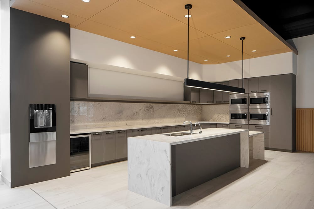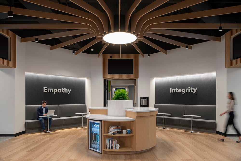One of the building’s most distinctive spaces features a radial wood ceiling structure that expands outward from a central column, forming a sculptural canopy over a lounge and social hub. The design encourages informal interaction while giving the space a strong architectural identity.