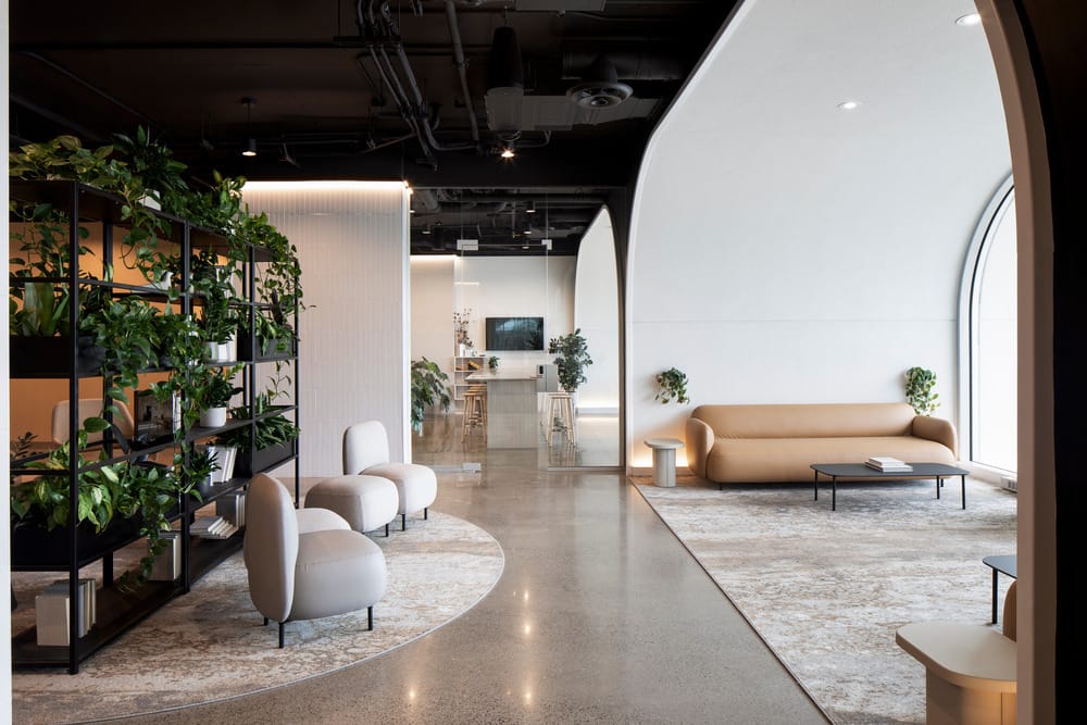 Inside, arches organize communal spaces along a linear promenade connecting co-working, kitchen, and fitness areas. Light walls, darker ceilings, and exposed systems create interiors that feel warm, efficient, and carefully calibrated.