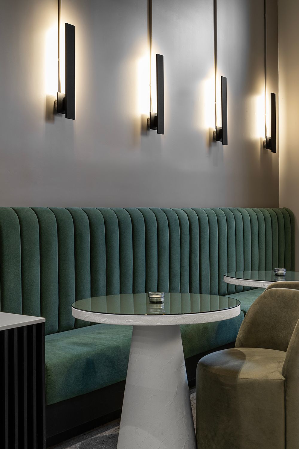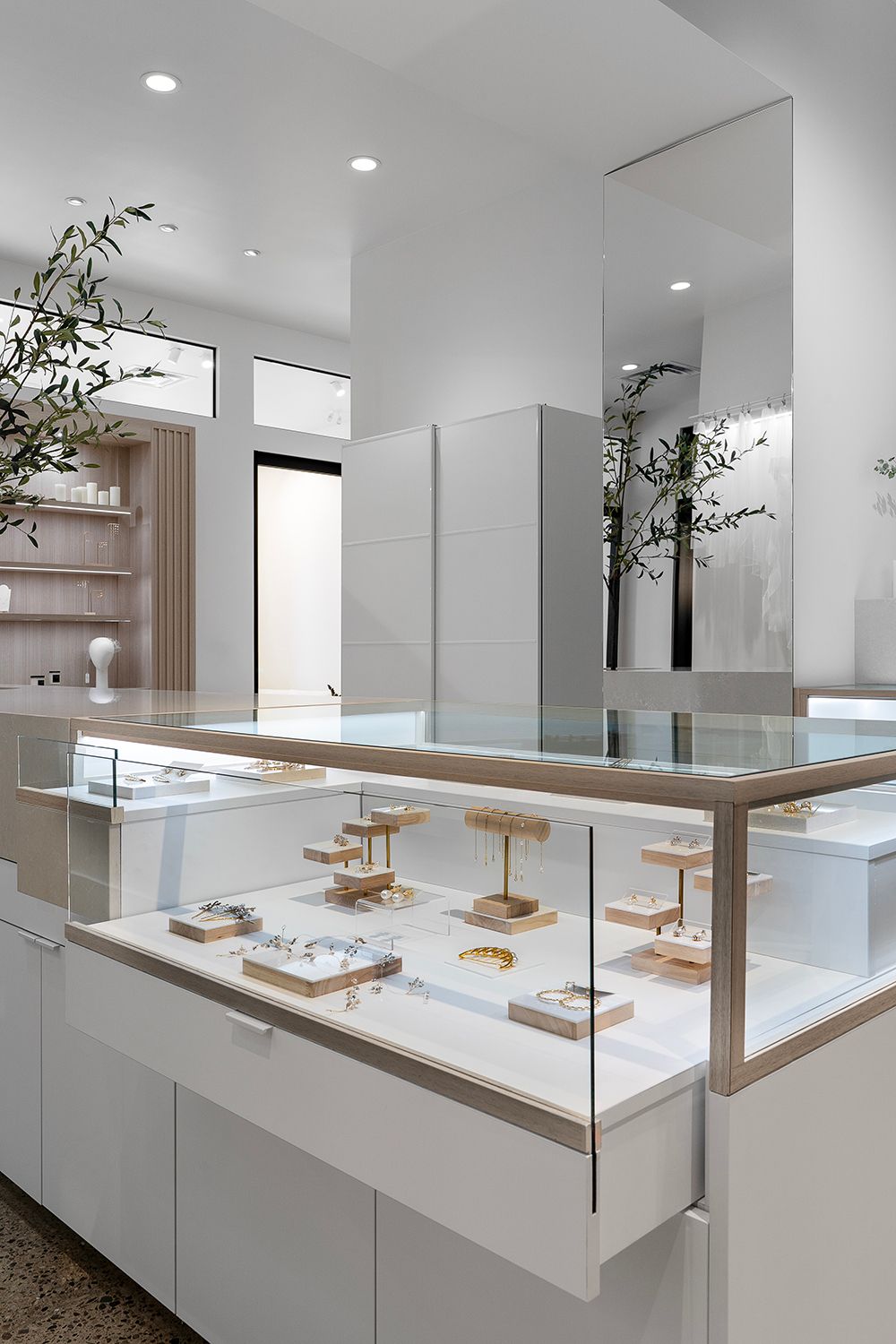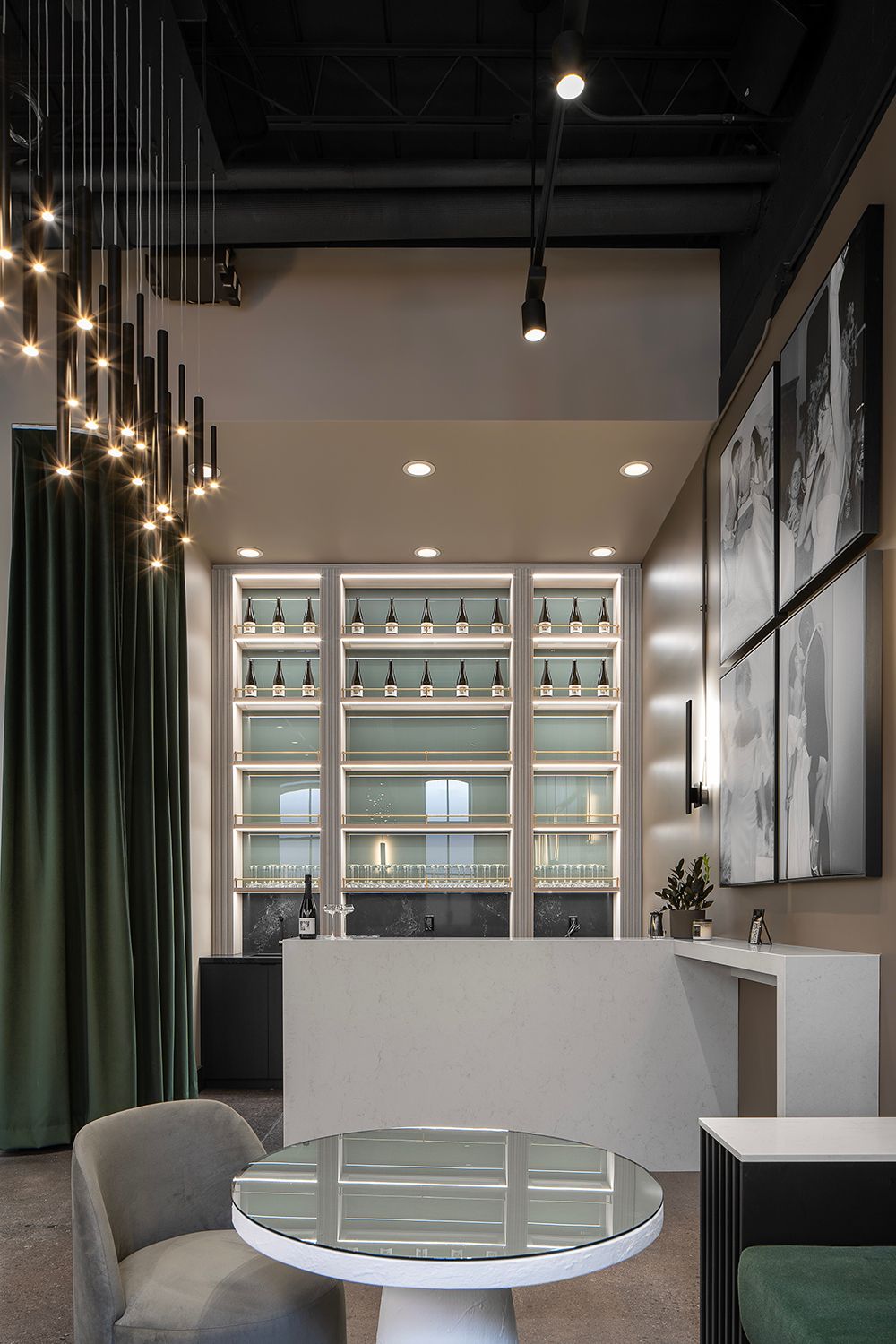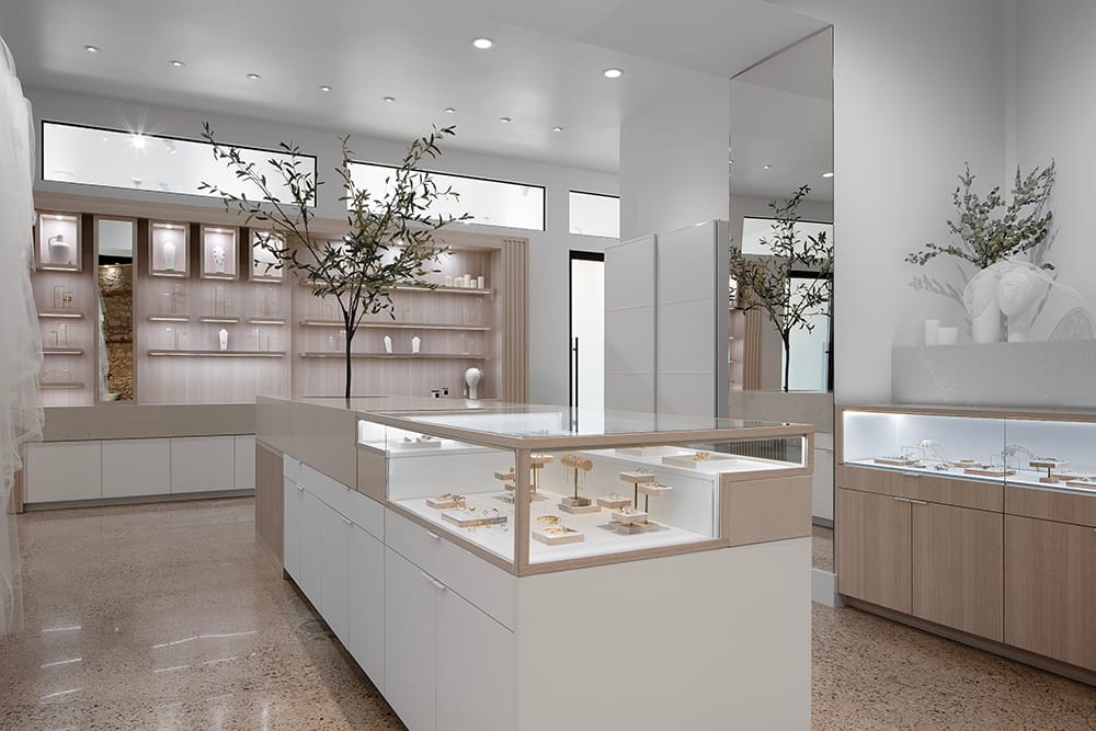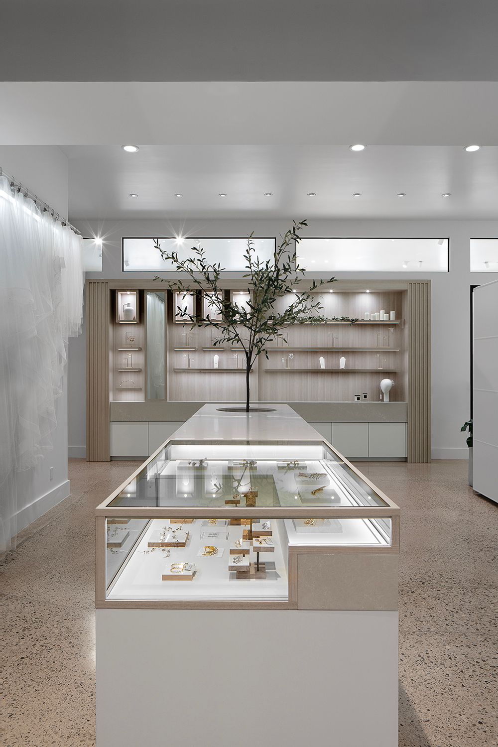 The boutique features custom millwork, meticulously designed to display a curated selection of bridal accessories and at the centre of it all is a gorgeous accessory island designed to house a beautiful Olive tree. Strategic lighting design accentuates the beauty of each piece, casting a soft glow that enhances the ambiance of the space.
