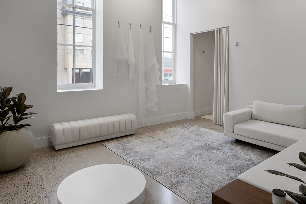 Each dress arrival room is furnished with modern minimalist furnishings and features large windows that flood the space with light.