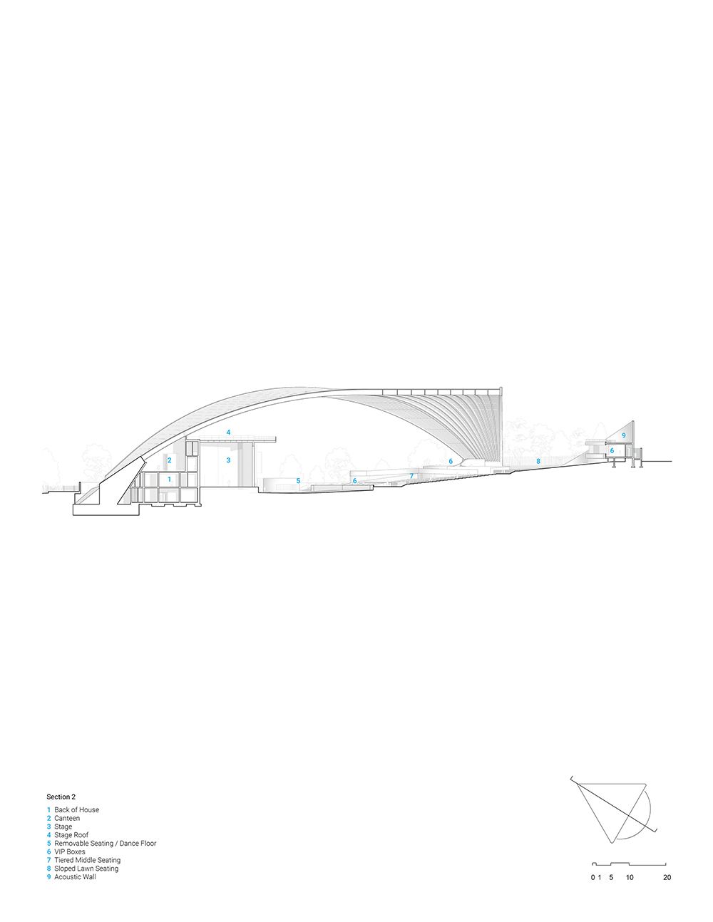 Flexible audience configurations include removable seating, lawn seating, standing-room dance floors, and VIP box suites. A continuous ramp network flanking both sides of the seating area targets Rick Hansen Accessibility Foundation Gold, ensuring equitable access throughout the venue.